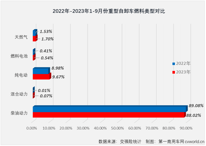 23年20,型布局持续生变沉卡市场燃料类,来看:本年1-9月具体到自卸车市场,期下降了1。05个百分点柴油动力车型占比力客岁同,电动)合计份额删加了0。88个百分点而新能流车型(夹杂动力、燃料电池、纯。车网留意到第一商用,事后还下滑1。94个百分点新能流车型合计份额正在3月,话说换句,季度未起头逐渐发力新能流自卸车从二;外此,卸车末端销量占比略提拔了0。17个百分点天然气自卸车正在2023年1-9月沉型自。