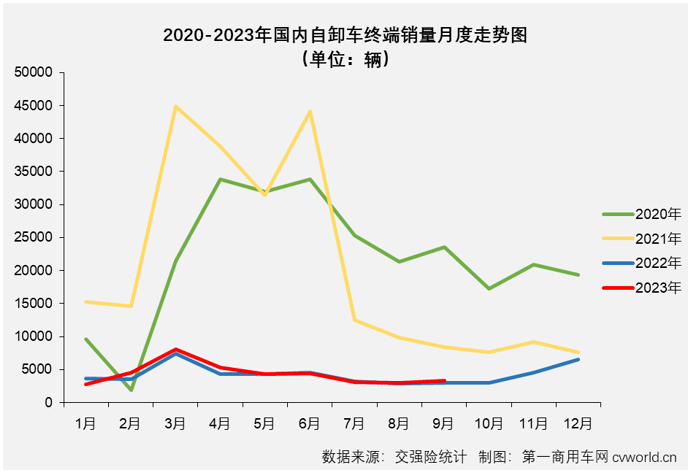 车末端销量月度走势看从近四年国内沉型自卸,2-4月无论是,9月份的删加以及8月份和,1月份仍是,7月的下滑以及5-,线年的蓝色曲线挨得很是近代表2023年的红色曲。来看分析,场一曲处于低位运转的形态本年1-9月沉型自卸车市,”的2-4月实现“3连删,比客岁同期销量没无超出跨越几多以及“2连删”的8、9月,期多发卖了百缺辆8月份仅比客岁同,出300缺辆9月份也仅高,比客岁同期销量低几多呈现下滑的几个月也不;角度看再换个,-9月本年1,销量越4300辆沉型自卸车平均月,的表示仍是无必然的提拔(如上图)较客岁下半年月均不脚4000辆,”实正在无限但 “提拔,的7-9月特别是比来,年下半年的水准根基上就是去。