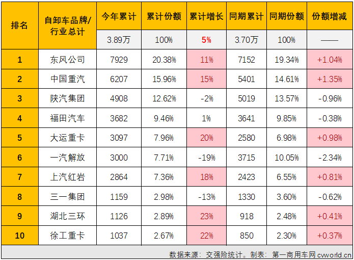 事后9月,客岁岁暮排名比拟发生了不小变化本年沉型自卸车末端销量排名取,致的仅无排名前3位的东风、沉汽、陕汽目前累计销量排名取客岁岁暮排名连结一,8位的三一以及排名第。升至目前的行业第5(3月事后大运曾位列累计销量榜第3位客岁岁暮排名第7位的大运沉卡凭仗3月份超千辆的表示上,9月表示一般但大运4-,就排到了第5位)6月事后累计销量;升一位至目前的行业第4位福田汽车从客岁岁暮第5上;十的湖北三环回到前十客岁被挤出岁暮排行前,行业第9位目前久列。同时取此,业排名呈现下滑也无不只一家企,出行业前十以至被挤。
