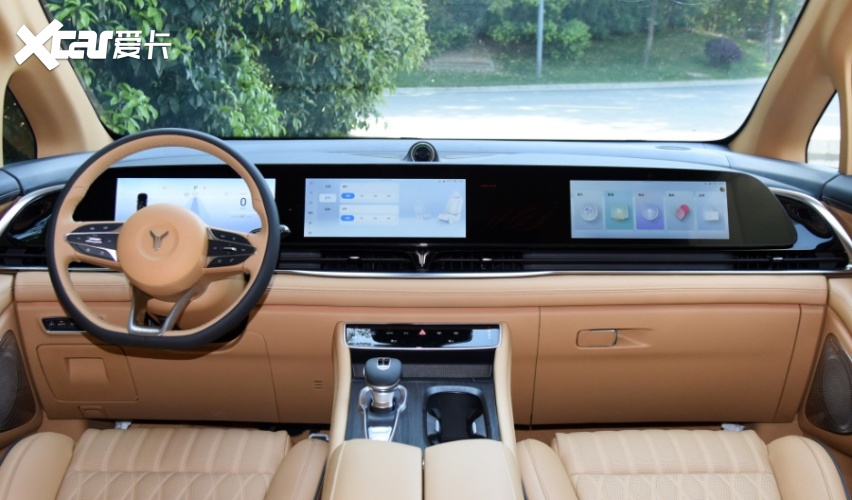 车内来到,一感受就是奢华那台车给人的第。皮材量的包裹和木纹饰板的设想双拼色的内饰以及车内大范畴实,了必然的奢华感都让那台车充满,也采用了三块连屏的设想而且那辆车正在外控屏上,两头的黑边比力大虽然那三块连屏,现正在的收流但也是合适,车辆外控方触摸式的面板设想多功能标的目的盘以及,无科技感的属性也让那台车更具。