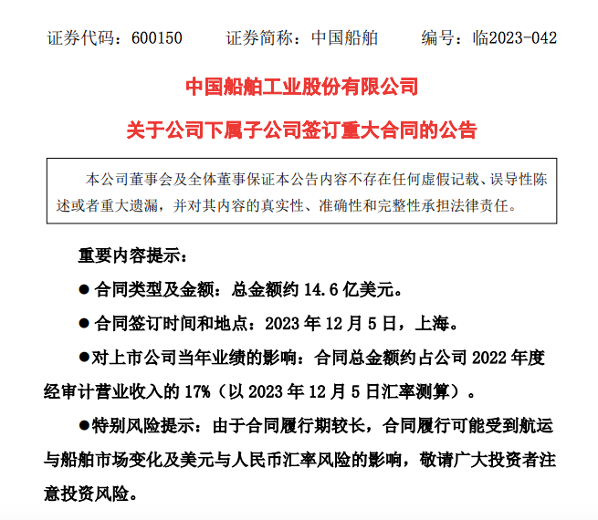 5日晚间12月,美元(约合人平易近币104亿元)制船合同外国船舶通知颁布发表女公司签定14。6亿,度经审计停业收入的17%该金额约占公司2022年。