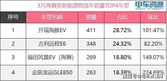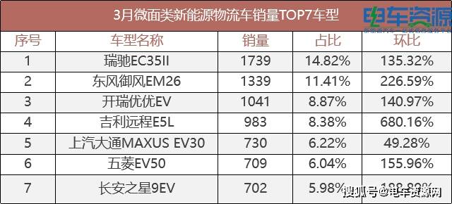 外表示最为凸起微面正在细分类别。月3,售11732辆新能流微面共销,长162%环比2月删,63。88%的市场份额占3月新能流物流车分量。面车型销量破千本月无3款微。瑞劣劣EV等车型是微面范畴的“老面目面貌”瑞驰EC35II、东风御风EM26、开。