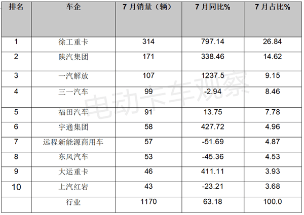 上汽红岩别离发卖99辆、91辆、58辆、57辆、53辆、46辆、43辆三一汽车、福田汽车、宇通集团、近程新能流商用车、东风汽车、大运沉卡、,第四—第十别离排名。