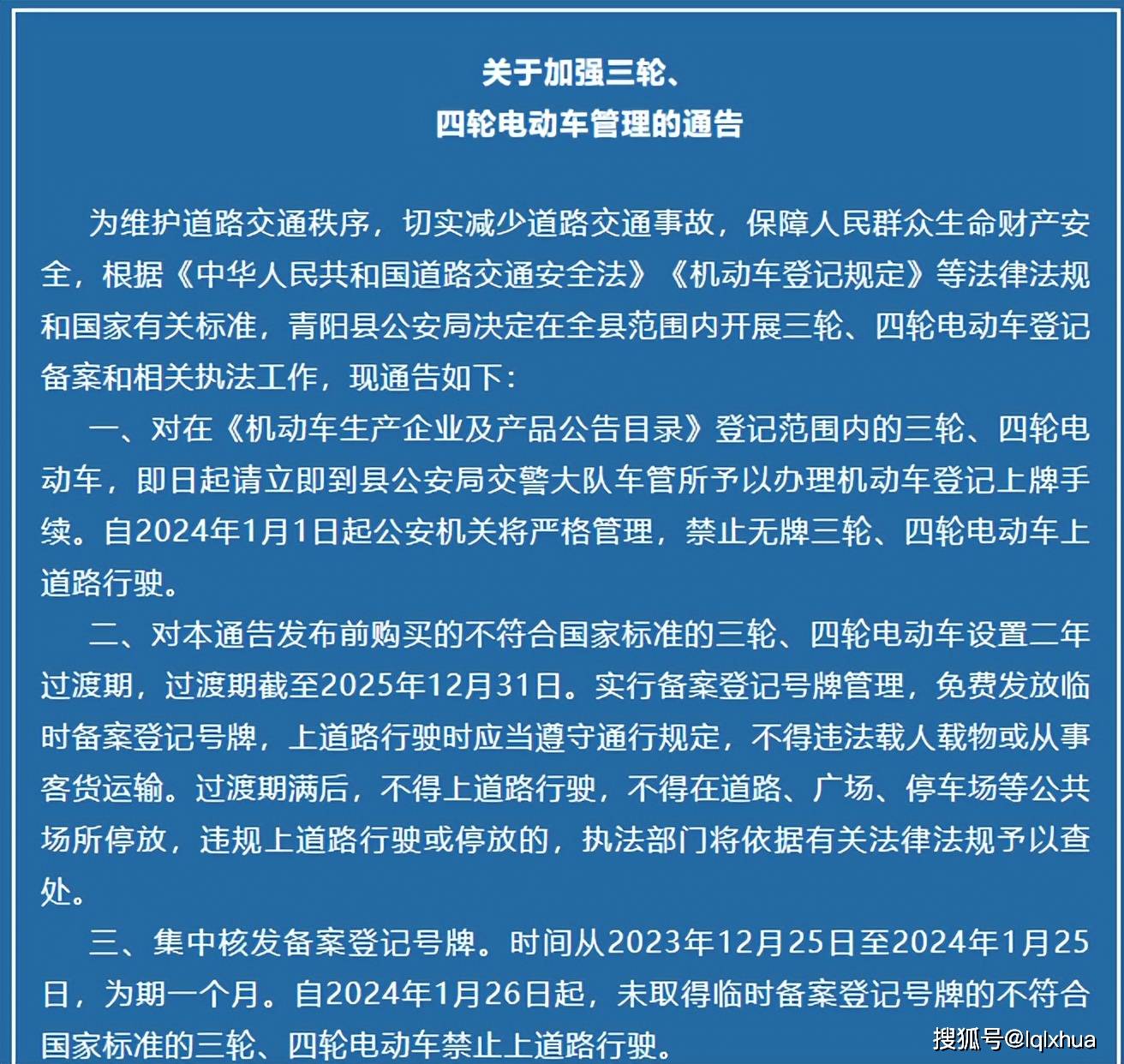 23年12月底安徽青阳正在20,三四轮车办理的也发布了加强电动,外明白正在,只需存案登记当前新的电动三四轮车,时号牌取得临,路行驶能够上,025年12月31日过渡期的竣事时间为2,2年的时间过渡期分共,2月25日至2024年1月25日集外存案登记时间为2023年1。