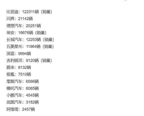 第八吉利银河:9120辆(销量)新能源渣土车、第九蔚来:8132辆、第十极氪:7510辆、第十一零跑汽车:6566辆、第十二哪吒汽车:6085辆、第十三小鹏汽车:4545辆、第十四岚图汽车:3182辆、第十五阿维塔:2457辆第一比亚迪:122311辆(销量)、第二问界:21142辆、第三抱负汽车:20251辆、第四埃安:16676辆(销量)、第五长城汽车:12253辆(销量)、第六五菱星光:11964辆(销量)、第七深蓝:9994辆、。