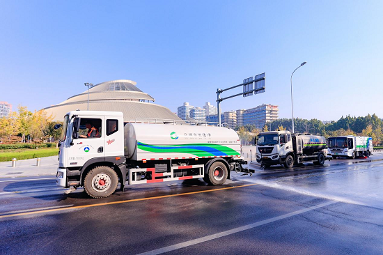 笼盖范畴广的特点针对落叶量大、,挥机械化功课劣势环卫集团充实发,+人工”连系模式采纳“冲刷+机扫,合保洁功课实行人机联。畅路面的树叶针对雨天粘,从干道进行高压冲刷先利用高压洒水车对新能源氢气汽车,理到路边将落叶清纯电动吸污车,共同沿路清扫再利用洗扫车,工排查清理最初进行人,业效率和结果切实提高做。
