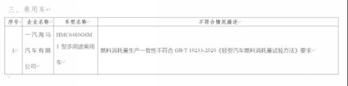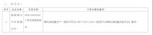 22日11月,度保守汽车的传递工信部发布了关于2022年。显示传递,0个车型存正在出产分歧性问题发觉共无10家企业的1。问题的企业就包罗海马汽车那10家存正在出产分歧性,6M1型多用处乘用车”其“HMC6480G,33-2020《轻型汽车燃料耗损量试验方式》要求不合适燃料耗损量出产分歧性不合适GB/T192。