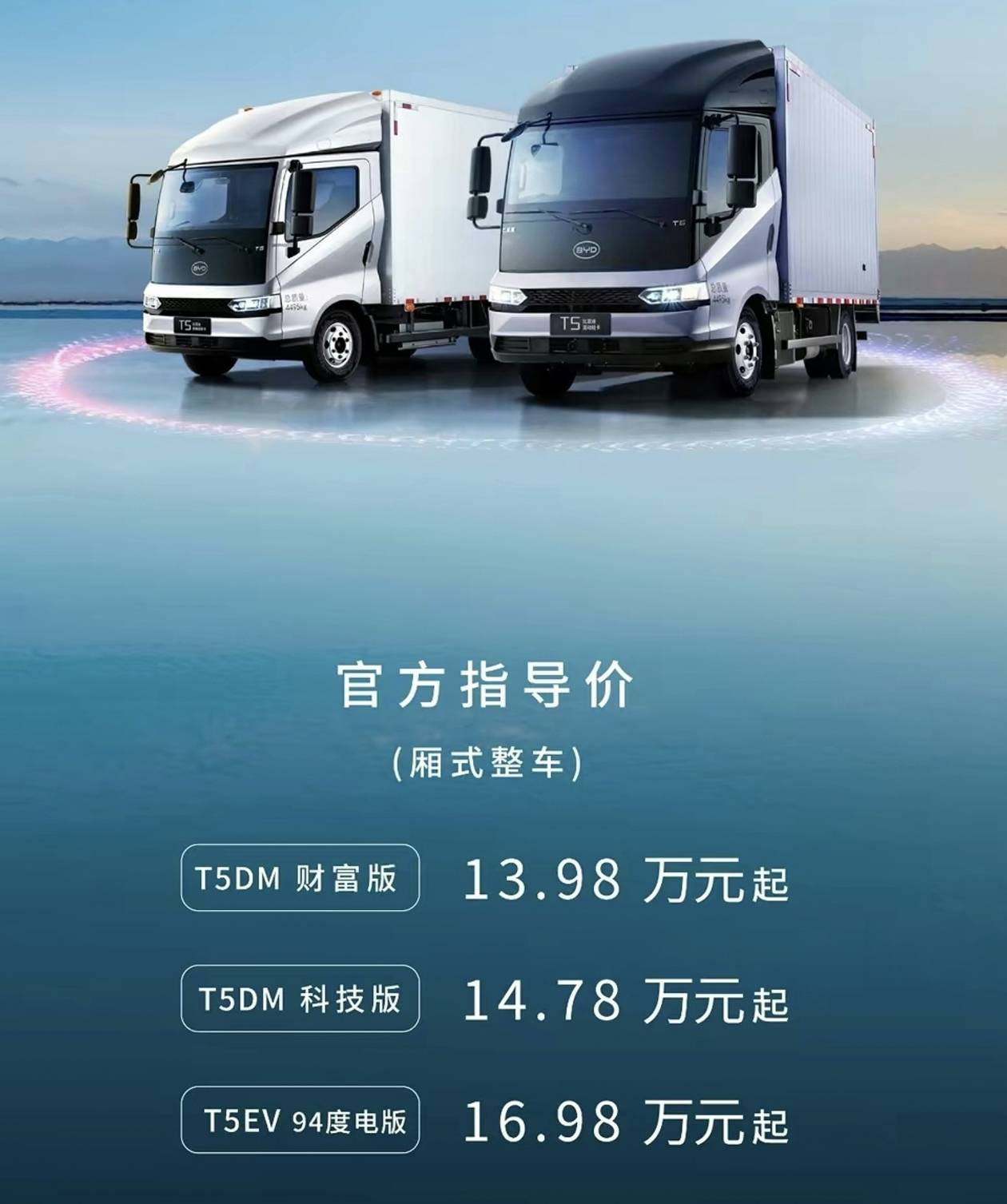 车市场的庞大影响力由于超等混动正在乘用,初次推出了超等混动T5DB比亚迪近日正在轻卡车型上也,度6m零车长,095×2120mm货箱尺寸4030×2,300~400kg比同级车可多载货,。4kWh电量18,航50km纯电动续,油耗9。2升亏电百公里,1000km分析续航跨越!方面配放,车身不变系统ESP、悬浮屏、OTA、云办事等手艺均来自乘用车1。5T插混公用骁云策动机、电动帮力转向系统、全液晶仪表、,至上亿的开辟费用既避免了数万万甚,卡产物降维冲击又能对同级轻比亚迪新能源冷藏车,起售价却仅为13。98万元如斯劣良的分析产物力它的,超等混动即将到来卡车范畴的一场,会福利不竭卡朋们将!